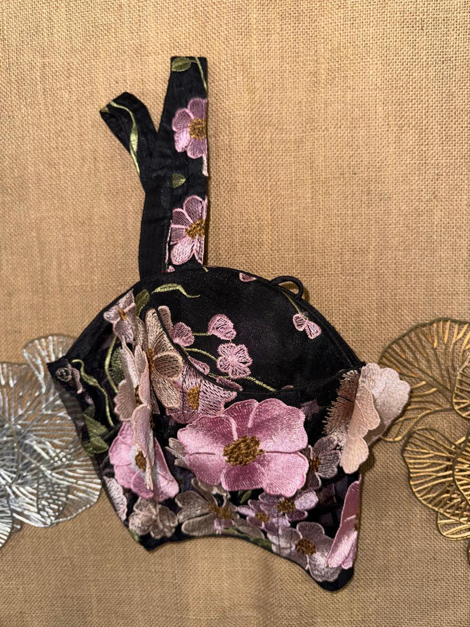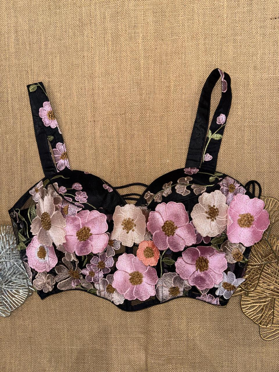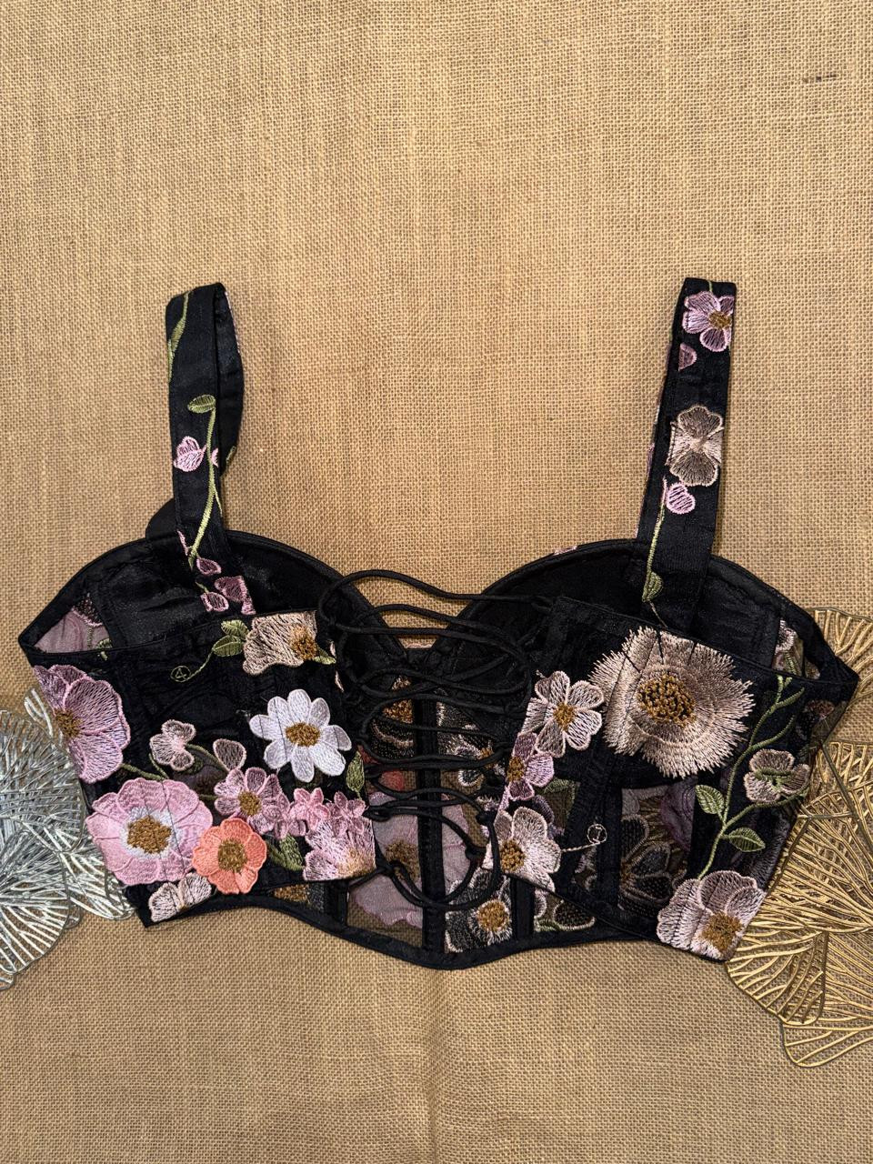 Black Floral Applique Corset Blouse