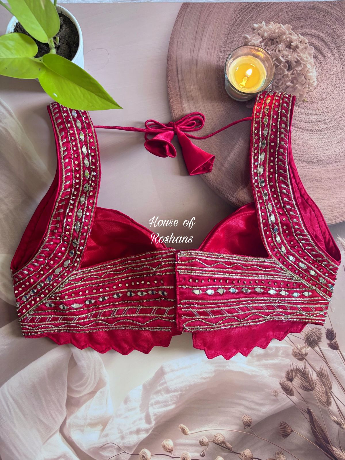 Red Pink Mirror Bead Work Cut Out Blouse